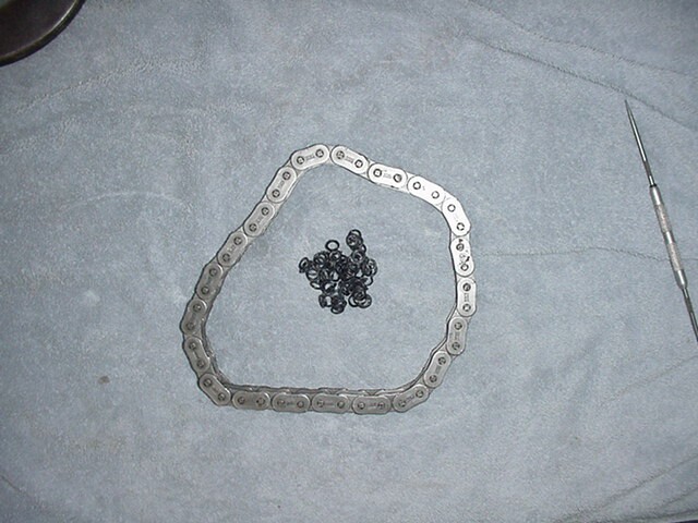 The chain in the Challenger transmission was still with in the factory wear limits but elected to change it and the seals since I needed to replace the output shaft seals and knowing the Challenger would be using a modified engine and driven to its limits I wanted the gear box to be as reliable as it could be. I got a chain from Bill Keefe, it is a O-ring chain pressed together and uses no master link, I have heard there was problems with oil affecting the O-rings and since the chain is in a closed case and running in oil they really are not needed, you can buy a much stronger chain by getting a O-ring chain, I spent about 1/2 hr and using a pick removed all the O-rings not the chain moves freely like a non O-ring chain.These transmissions are a great little and very tough gear box they require very little maintenance and will take all kinds of abuse, you can see in the picture below when the chain gets stretched it can actually make contact with the cases, when the chain breaks it usually makes its own exit from the cases leaving you with a pile of junk. Check yours make sure the chain cant touch the cases like the blue arrow.
