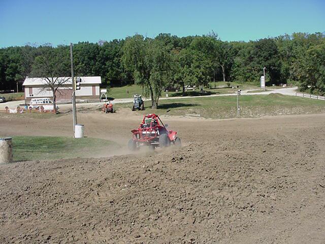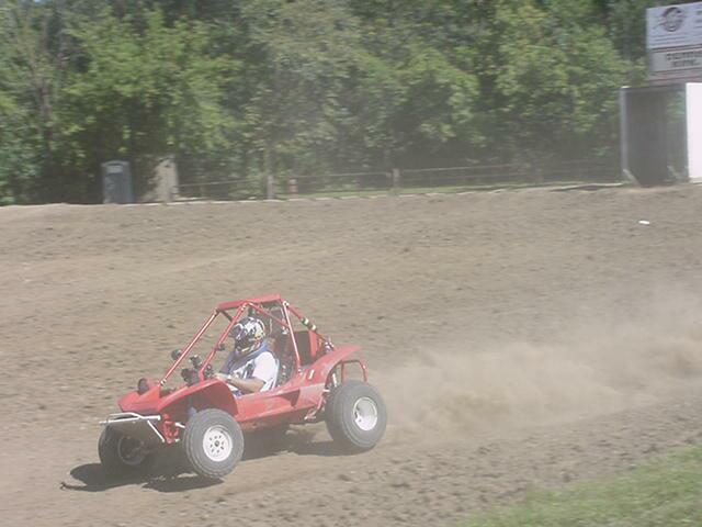 On my first lap it didnt take me long to figure out something was wrong my front left suspension was bottoming out bad, after getting back to the pit area I put my guage on the shock and sure enough it was low on nitrogen, wouldnt you know I take my nitrogen tank with me every where I go but decided to leave it home this time, lucky for me Cowboy had his tank with him and loaned me some nitrogen, Thanks Cowboy I owe you one!Me coming around for a big WOT sweeper