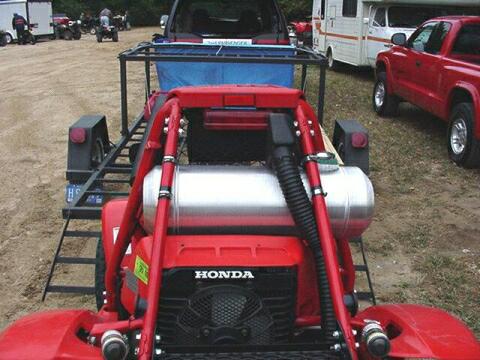 Notice the 5 gallon auxiliary gas tank and extra large cooler rack