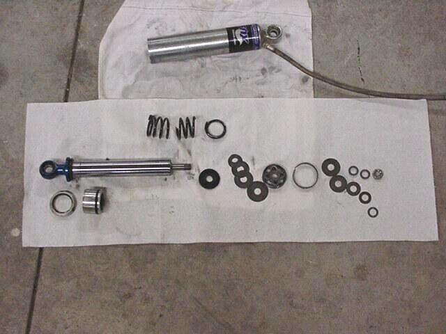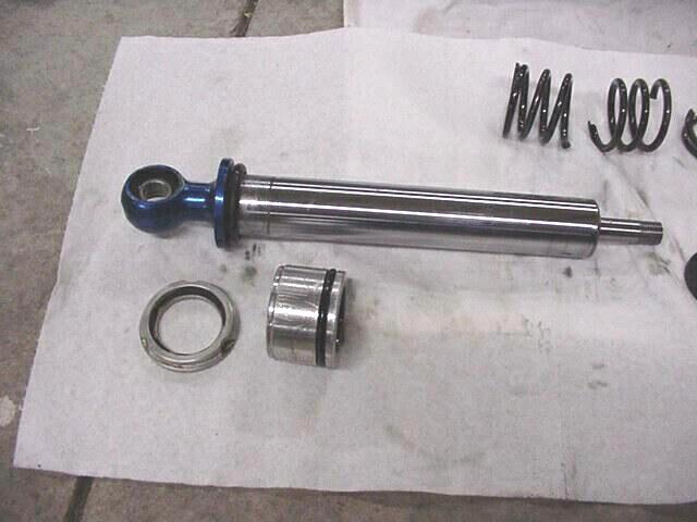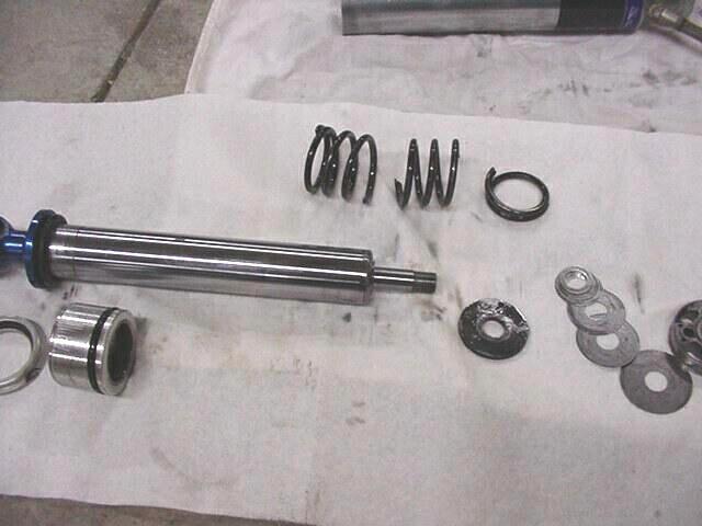 Here it is taken apart everything is laying in order Notice the broken top out spring :-( I figure it was stressed when I had the rebound setup wrong and could feel the shock knocking when the front tires left the ground.