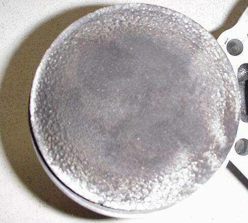 After I got home I cleaned up the Pilot to get the weekends mud, dirt and dust off then it was time to pressure test and see if there was any kind of leak, the motor held 11 pounds for 20 minutes good and tight I can rule out any kind of air leak. Soon as I removed the head I knew something other than a seizure had brought my motor to a hault You can see by looking at the top of the piston that something had been bouncing around inside my motor for quite a wile. Below you can see where my piston stuck to the cylinder wall on the intake side. Look close at the piston below and you will see where something came between the piston and cylinder wall almost 180 degrees from the scoring on the piston. A close up of the metal that was beat away from the the top of the piston, notice almost no scoring on the exhaust side of the piston. Below you can see where the piston stuck to the cylinder wall.![]()
