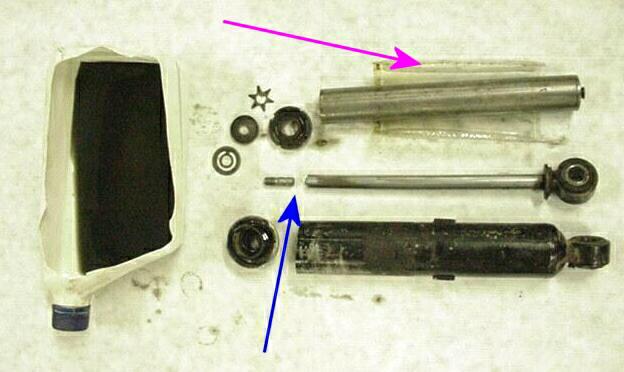 I took the portable ban saw and cut the shock apart, just as I suspected the end of the shaft broke off (blue arrow) you can see the oil was all black and nasty, too bad these shocks were not serviceable the valving in this shock is a joke as you can see by the 2 shims they installed, the shaft is bent and is probably what caused the shaft to break since it would put the piston into a bind as the shock traveled through its stroke, there was a plastic bag that wrapped around the center cylinder I assume this contained nitrogen at one time or another and was used as a bladder.