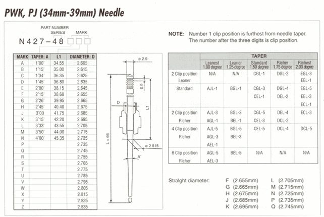Hoser's Pilot and Odyssey Current Jetting Specs This page is for information only don't be a mutt and try to use these settings, every engine requires different jetting yours may not require the same as mine does :-) 440jets Pilot (using a 440 snowmobile engine out of a 9500 Blizzard with a 38mm Mikuni Super BN carb) HI SPEED 125 Spares 120 LO SPEED 67.5 spares 65 62.5 Challenger 39mm PWK 10-04-02 72RAB HQ (Running a Mossbarger 250 Liquid Cooled Engine) Challenger project is here Changed the pilot jet from a 55 to a 38, was to lean went to a 45 still slight hesitation beck to the 55 will have to try a 50 in future. 10-18-03 air screw 2 turns out 140 main jet EEG needle clip one notch up from center position Notes: With 55 pilot jet the engine was running real rich from idle to 1/2 throttle no hesitation and would rev out clean just leaving a dark plug and the blue trail of smoke when running slow around the yard, went to a 38 and now the bottom end is clean (no smoke) but it hesitates, swapped to a 45 and the hesitation is less but is still not right, will try a 48 or 50 next. My Pilot 39mm PWK UP DATE 6-09-02 Settings when I was running my full modified Pilot engine, porting, coolhead 49cc dome, 39mm PWK, Power Pros REV pipe, long silencer, Power Bloc clutch with 12 washers 3-3/4" spring, modified stock airbox with dual openings and prefilters. Jetting was good from 0 to 5000' elevation in the East, South, Mid West riding areas, richer settings were needed for dry desert locations below 3000' elevation. Changed the pilot jet from 58 to a 48 air screw 2 turns out 160 main jet DGH needle clip one notch up from center position Number on the side of my carb 72RA4 NCQ Notes: bottom end always has been real fat just trying to clean it up some, 48 made a good improvement, think I will stick with it, I also swapped needles with the wifes Pilot (get the number of needle and put here) the needle in hers is much leaner, works great in my machine! Wifes Pilot 39 mm PWK 2-15-04 Engine is ported, modified stock reed cage, Power pros Torque pipe, cool head 49cc dome long silencer, Power Bloc clutch 3-3/4 spring 12 washers, modified stock airbox with dual openings and prefilters. Slide is a #6 Needle is DGG on bottom notch Rest is unkown at this pointNew needle added to collection is a DGG 7-16-03 Wiggens current base line jetting 18 Apr 2005 39mm PWK slide #6 needle DGH set at the second notch from bottom main came with a 160 installed a 165 pilot jet #60 Air Screw 1-1/2 turns out hoser enhancements to the cylinder and headOften Imitated But Never Duplicated