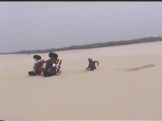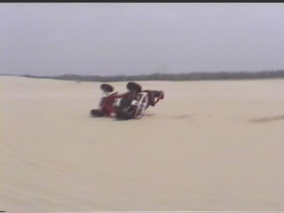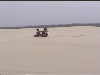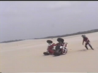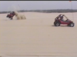 "For those who weren't there, the wind was blowing quite fiercely and I was making a high speed turn when the right front wheel caught, jerking the wheel left, thus tightening the already sharp turn when the left front tire lifted, the wind caught and over I went. WHAT A RIDE, but an experience I'm not anxious to repeat anytime soon, but probably will...oh well, c'est la vie. The only damage suffered was a couple of bent front fender mounts and a bent flag mount; which by the way is a 4" long, 1/4" thick straight steel plate. NOT ANYMORE! ;-) Thanks to Red Rider and Hoser, in no time at all we had straighted all three pieces and I was back in business though with a flag pole leaning a bit to the left. " DUNEPILOT![]()