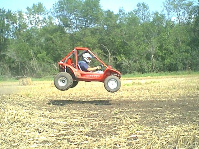 Several people made the trip to Pilotcat's house to check out his track unfortunately I couldn't make this trip but Pilotcat was nice enough to send me these pictures just to show me what I was missing :-) Pilotcat plans to have another roundup at his place sometime around 8-25-00 I should be able to make that one and join in on the fun. Looks like Supersail almost did the old lawn dart over this jump, Always blip the throttle when coming off a jump to keep the nose up. From what I can see you could hit this jump WOT.