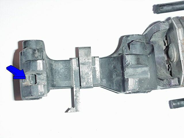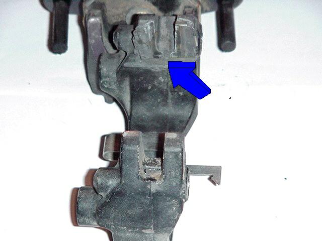 Pilot Rear Brake Assembly (5-24-01) Here is a inspection point that needs to be inspected more often than when you change your brake pads (I Learned the hard way) I would suggest removing, cleaning, inspecting and lubricating 3 times a year if you ride as much as I do or at least one time between brake pad replacement. What you see in the first picture below is the bracket (Part # 13 on last picture on this page) that holds the calliper, it bolts to the transmission the pin bolts(part #21) goes into the holes with the blue arrows, each bolt is lubricated with grease and protected by rubber boots, my boots were long worn out and didn't provide that much protection to keep dirt and dust out, once dirt gets inside it gets between the steel bolt and the aluminum guess who wears out first :-)Below you can see where the calliper pin bolt wore through the housing.