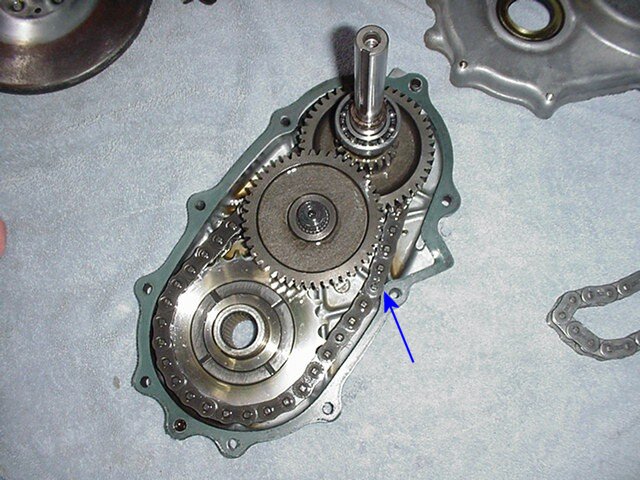 The chain in the Challenger transmission was still with in the factory wear limits but elected to change it and the seals since I needed to replace the output shaft seals and knowing the Challenger would be using a modified engine and driven to its limits I wanted the gear box to be as reliable as it could be. I got a chain from Bill Keefe, it is a O-ring chain pressed together and uses no master link, I have heard there was problems with oil affecting the O-rings and since the chain is in a closed case and running in oil they really are not needed, you can buy a much stronger chain by getting a O-ring chain, I spent about 1/2 hr and using a pick removed all the O-rings not the chain moves freely like a non O-ring chain.These transmissions are a great little and very tough gear box they require very little maintenance and will take all kinds of abuse, you can see in the picture below when the chain gets stretched it can actually make contact with the cases, when the chain breaks it usually makes its own exit from the cases leaving you with a pile of junk. Check yours make sure the chain cant touch the cases like the blue arrow.