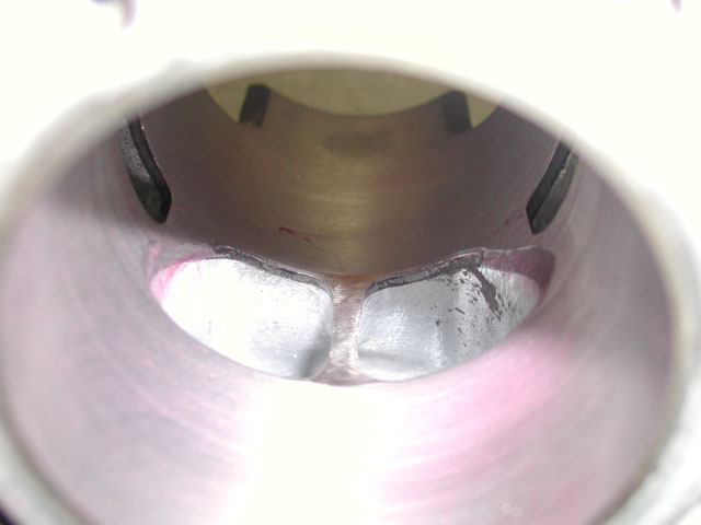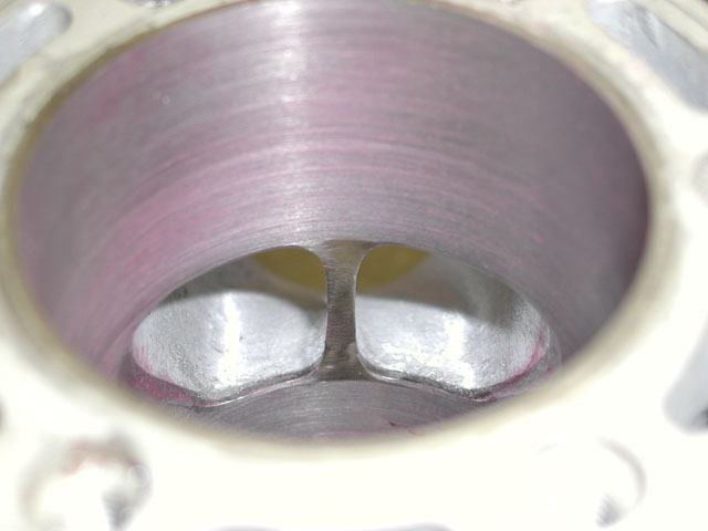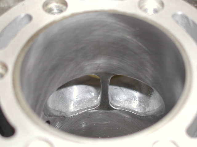 I'm going to give this piston .0022" - .0026" clearance inside the bore. So, with that in mind and knowing that I want to leave more clearance on the exhaust bridge than the piston gets in the bore, I can rough the exhaust bridge in. Rough size bore = 2.6975" Piston = 2.697" (actual measurement) Target bore size = 2.6992" to 2.6996" Target (extra) exhaust bridge clearance = .0045" to .0065" Final exhaust bridge measurement = 2.704" to 2.706" I'll use the rough Cratex wheel and take the diameter of the bore at the exhaust bridge to about 2.7045", knowing the bore is already .0005 larger than the piston. Now I'll hone the cylinder to final size The final bore came out to 2.6996". The measurement at the bridge is (about) 2.7045" from the rough wheel. With the fine Cratex I smooth out the cut marks and work the bridge from the top and bottom to make it as uniform as possible. Since this cylinder has a bust port (boost port) it is impossible to check the clearance at the exhaust bridge directly opposite the boost port, so I'll concentrate on doing the best I can using the reflection of the light to help point out imperfections - it's like looking down the body of a car. You can see flaws. When I'm satisfied I've done my best I record the measurement. In this case it is 2.7052". That puts me within the tolerance for the clearance I need. Here's some things to go by when trying to decide how much bridge clearance to cut in: The smaller the bore, the less extra bridge clearance is needed. The larger the bore, the more extra bridge clearance is needed. High compression builds need more clearance. High performance builds always need more clearance than OEM non-ported. High exhaust port requires more clearance. Long power stroke requires more clearance. Stroker motors require more clearance. After writing this last bit out it seems that almost any build other than stock will require a little more clearance than OEM. Honda claims .003" to .004" for their OEM TRX barrels - actually that's a little more than I thought it said. I was thinking it said .002" to .003". I would consider .003" to be absolute minimum for anything with even a high compression head and/or a pipe and air cleaner. The engine will run with tighter clearance but you'll notice local seizures in that area upon disassembly. This photo shows the final hone, but the bridge is still rough from the big Cratex wheel.
