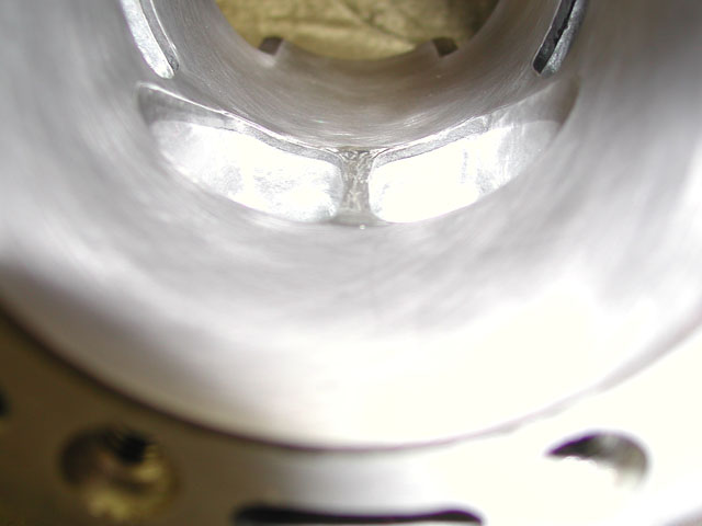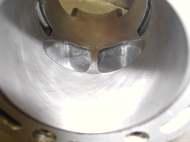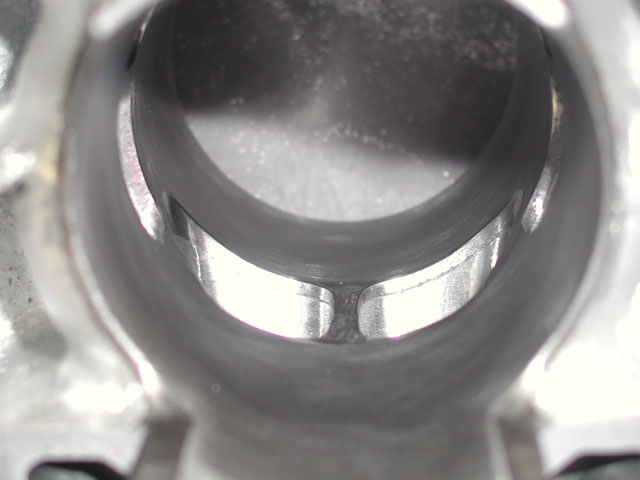 With most of the bridge work done you can see its tracks. It's basically metal dust. There's barely a texture at all in that area. It's much smoother than OEM. You may also notice the exhaust port bevel at BDC. It is beveled where it needs to be. Further up the port in changes into a rolled edge. In fact, I don't know if you can really see that in any of the other photo's. The exhaust bridge also has rolled edges. The roundness to the corners of the exhaust bridge and the exhaust port outer edges is worth plenty of power. Don't forget this important area.