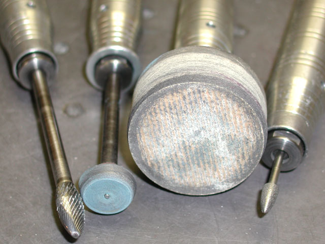 This was taken from Rick at MacDizz.com click here to read the full thread Cant view the link then you might need to join up to access it, this is a small sample of what can be found on Rick's site and is well the price of admission OK guys - you wanted to know this (hoser) so I've taken a few shots of a cylinder while I was working on it. Let's look at the tools I use to chamfer the ports and relieve the exhaust bridge. From left to right - This is a smooth spiral cut carbide cutter. Though it may show traces of aluminum on its teeth, it is what I use for roughing in the chamfer on the ports of many large iron cylinders - like the one I'm about to show. It's a 68.5 mm bore TRX250R cylinder. Don't get me wrong. I do very little with this tool during this operation, simply because it can remove too much material very quickly. When a cylinder is bored, even if it isn't going to be ported, it's necessary to slightly 'dress' the edge of vertical port walls so the honing stones don't catch them. The idea is to hone the cylinder without the stones snagging a port during every stroke. Lightly dressing the edge of the vertical port walls, especially that of large ports, addresses this issue. Next, to the cutter is a fine Cratex wheel. Obviously this isn't the order I use the tools in. I apparently wasn't thinking that when I snapped the photo. It is used after the large Cratex wheel to its right. The fine Cratex wheel is very fine. It takes quite a bit of time to remove the marks the rough Cratex wheel leaves, but it takes much, much more time than that to simply relieve the bridge with a fine Cratex wheel. The fine wheel doesn't really remove any material (to speak of) it just removes the traces of the rougher tool. It leaves the surface shiny, with a smooth finish. A finish that a piston ring could slide up and down on several million times without causing damage to it. I also use the fine Cratex to finish the rest of the ports. It will polish out the marks made by even the diamond wheel. Now, the rough Cratex is just that - rough. I don't have a part number because I've had it for years. I can tell you that it's 2" in diameter and the color of the wheel dictates how coarse it is. All of the Cratex wheels are color coded. If you want one like this, ask for a tan 2 inch wheel with a 1/4" drive. I'm sure it'll be the right one. It is necessary to turn this tool very slowly - v e r y s l o w l y ... it removes iron in a hurry. On a thin bridge I spin the tool about 50 - 60 RPM and very carefully r un it up and down the bridge, taking care to touch all of it equally if possible. When I'm about half done, I turn the cylinder over and attack it from the other side. This tends to even out the tools tendency toward wanting to remove more on the right side of the bridge due to its rotation. It takes about 120 seconds total time. Last is the diamond tool. I like the diamond impregnated tools for chamfering ports too. Sometimes I do not use the spiral cutter at all for chamfering - I use the diamond instead. is much more forgiving and is much harder to make a mistake with. This is especially important with small bore cylinders. These tools come in all shapes so their use is widespread throughout my cylinder work. I use them for iron port transfer walls where a carbide cutter wants to bounce, or sometimes to reach in places where no other tool will go. They leave a fairly rough finish on aluminum, but just about right for inlet and transfer ports. I use them even more in NiCaSil cylinders. The diamond cuts the plating better than a carbide cutter does. A carbide tool turning against a NiCaSil liner sounds like fingernails screeching down a chalkboard. It rings so loud that ear plugs are a must. Any serious material must still be removed with carbide, but be prepared to have a bunch of dull tools in a hurry when you use carbide against NiCaSil - even for a moment.Most of you guys know that when I'm porting a cylinder I like to have it bored first. This leaves room for less error of the port timing and leaves less material to remove with hand tools. Boring a cylinder 'on size' or just slightly larger than the piston is perfect to me. In the first photo the bore finish is rough - right off the boring bar. The red or pink you see is what's left after I used Berryman's B-12 and a shop rag to wipe most of the machinists die away. Just prior to this the scribe lines were visible.