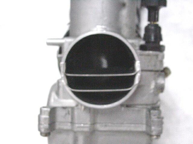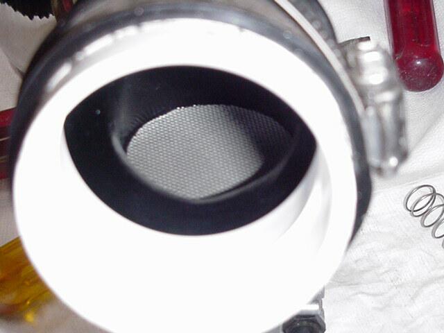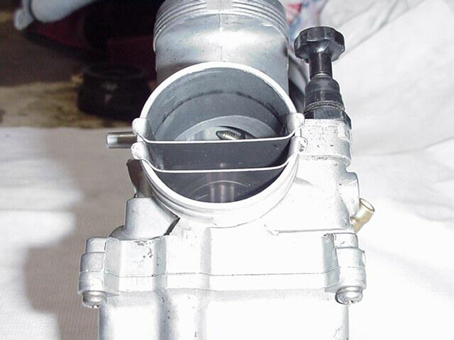 Modifying the 39mm PWK by hoser.. I was running a 34mm carb on the Mossbarger engine and it seem a little flat and had a slight bog in the mid range, I wanted to try something new on my Pilot carb so installed a MAF screen , I put the carb into the lathe and machined a recess into the inlet bell of the carb then trimmed the MAF screen to fit, it is held into place with JB weld.A poor picture but you can see the screen.