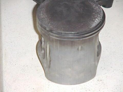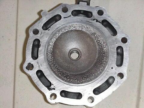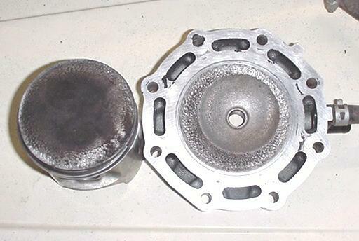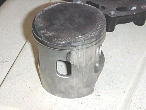 After I got home I cleaned up the Pilot to get the weekends mud, dirt and dust off then it was time to pressure test and see if there was any kind of leak, the motor held 11 pounds for 20 minutes good and tight I can rule out any kind of air leak. Soon as I removed the head I knew something other than a seizure had brought my motor to a hault You can see by looking at the top of the piston that something had been bouncing around inside my motor for quite a wile. Below you can see where my piston stuck to the cylinder wall on the intake side. Look close at the piston below and you will see where something came between the piston and cylinder wall almost 180 degrees from the scoring on the piston. A close up of the metal that was beat away from the the top of the piston, notice almost no scoring on the exhaust side of the piston. Below you can see where the piston stuck to the cylinder wall.![]()