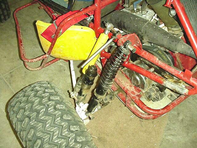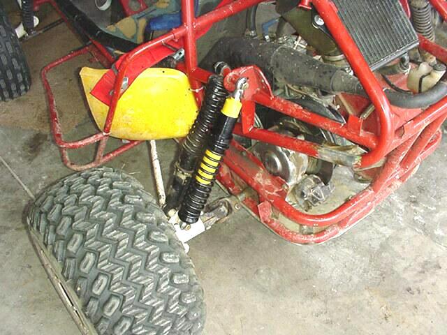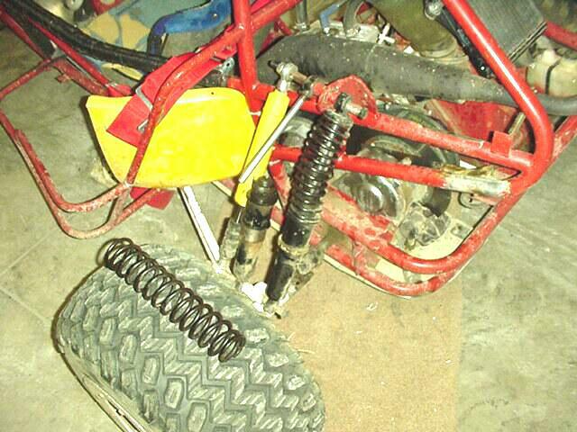 I decided to make some jetting changes since the last Badlands trip proved that the jetting was way too rich, I started out by turning the air screw out 1/4 turn and lowering the needle one notch, I took it around the yard a few laps then the neighbor kid showed up on his three wheeler so time to let my kid do the driving. My son made about 4-5 laps around the yard when one of the rear shocks decided to give out, time to buy new springs for the BILSTEIN shocks I got from Redrider, Red suggested getting them from http://www.pitstopusa.com but first I needed to figure out what the spring rate is for the current springs so I did some searching and found a Spring Rate Calculator the old spring measures 2-3/4" OD and the spring wire diameter is .265 and their is 13 active coils on the spring giving me a spring rate of 34.7635 The spring length is 11"Looking at the shock it appears that the end of the shock where the piston attaches to broke off, I will cut the shock apart to verify.