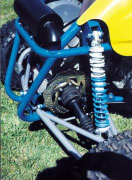 eng. type............2 stroke from snowmobile (rotax) liq. cooled disp.................2 or 3 cyl. (500 to 800)cc carb.................36 to 40mms elecrtic start.......+ pull start trans................cent. clutch 2nd drive............transf. case F-N-R final drive..........drive shaft-this means axles like a Pilot length...............102" width................63" hieght...............49" susp. front................dbl. a arm rear.................single a arm-kinda funky looking fr. travel...........280mm-roughly 16" rear.................same shocks...............emulsion or gas fully adj. frame................multitubular wheels...............10" front................10x5 rear.................10x8 Wilwood disc brakes fr. dia..............180mm rear.................265mm fr. caliper..........2 piston rear caliper.........4 piston 5 point safety harness rack and pinion steering box-steering wheel w quick release hub made in Canada