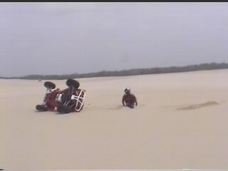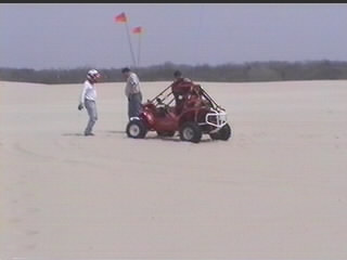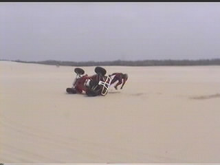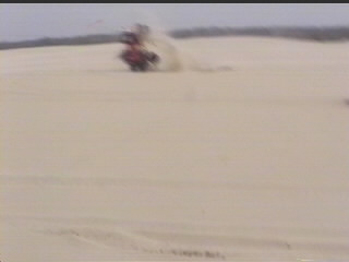 "For those who weren't there, the wind was blowing quite fiercely and I was making a high speed turn when the right front wheel caught, jerking the wheel left, thus tightening the already sharp turn when the left front tire lifted, the wind caught and over I went. WHAT A RIDE, but an experience I'm not anxious to repeat anytime soon, but probably will...oh well, c'est la vie. The only damage suffered was a couple of bent front fender mounts and a bent flag mount; which by the way is a 4" long, 1/4" thick straight steel plate. NOT ANYMORE! ;-) Thanks to Red Rider and Hoser, in no time at all we had straighted all three pieces and I was back in business though with a flag pole leaning a bit to the left. " DUNEPILOT![]()