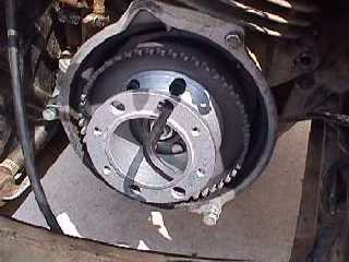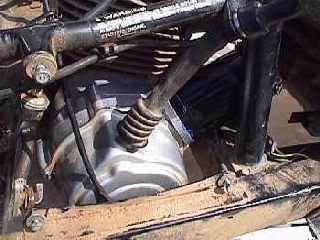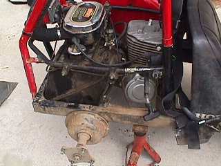 Second, remove the right side tire and fender. Then unbolt the engine off the engine bed. |