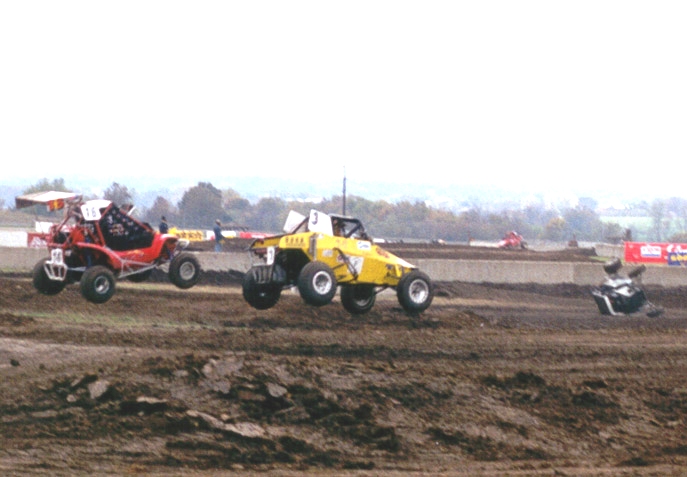 This is from the Topeka race, The car on it's side at Topeka is Kurt Gallina in his modified pilot. He did a one-wheeled wheelie out of a turn and twisted it onto it's side. I think Richard Kozar helped him get going again. Radical