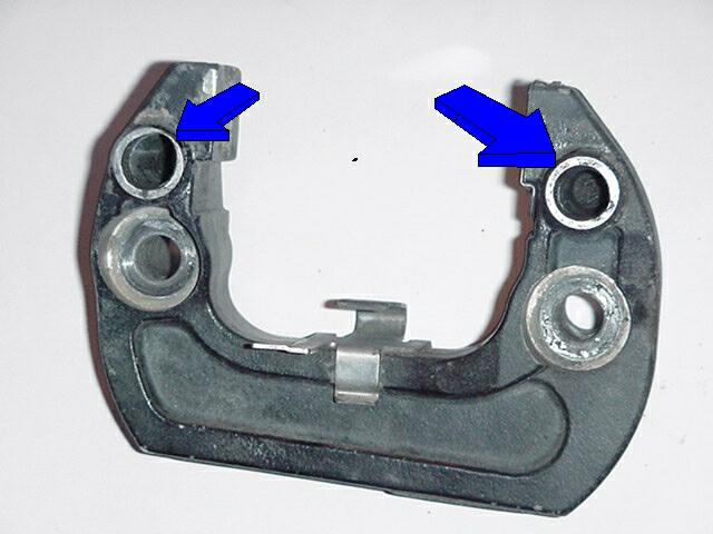 Pilot Rear Brake Assembly (5-24-01) Here is a inspection point that needs to be inspected more often than when you change your brake pads (I Learned the hard way) I would suggest removing, cleaning, inspecting and lubricating 3 times a year if you ride as much as I do or at least one time between brake pad replacement. What you see in the first picture below is the bracket (Part # 13 on last picture on this page) that holds the calliper, it bolts to the transmission the pin bolts(part #21) goes into the holes with the blue arrows, each bolt is lubricated with grease and protected by rubber boots, my boots were long worn out and didn't provide that much protection to keep dirt and dust out, once dirt gets inside it gets between the steel bolt and the aluminum guess who wears out first :-)Below you can see where the calliper pin bolt wore through the housing.